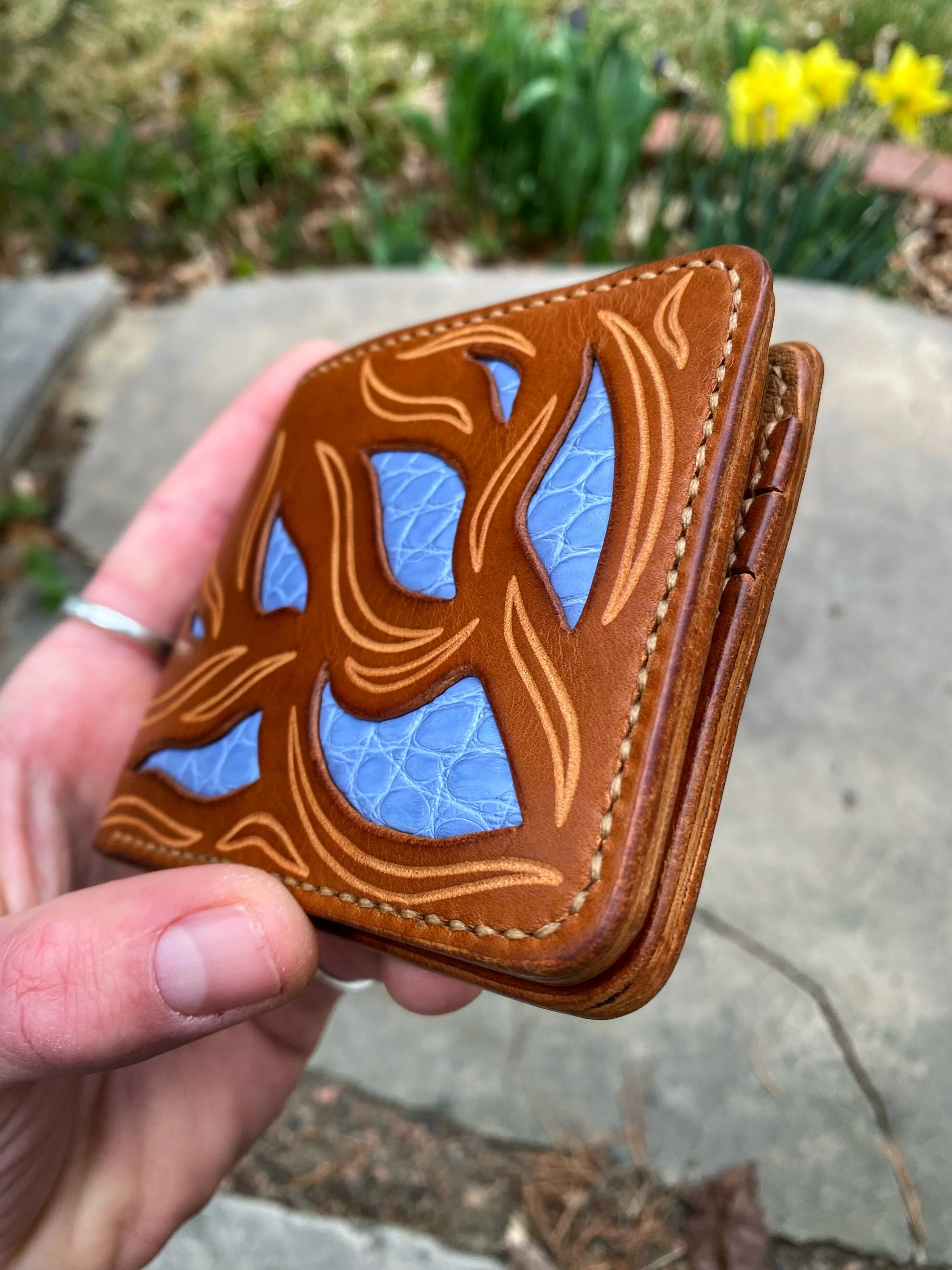 A 9-pocket classic bifold wallet made with hand-engraved cognac vachetta leather, glacier blue alligator flank inlays, and a golden chèvre interior.